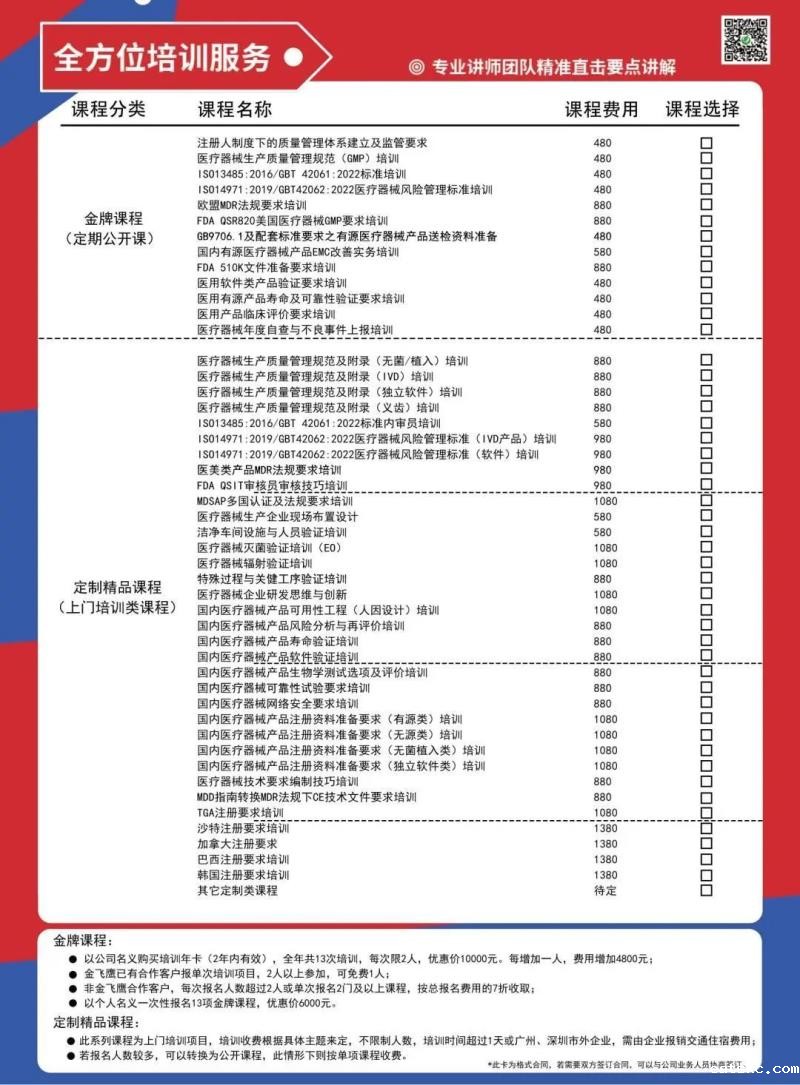 培训分为定期线下公开课上门培训两种形式,共有13节金牌课程+34节定制精品课程(详见下方海报,课程主题涵盖了医疗器械国内外注册及体系的多个环节、多个领域,优选betway必威西盟体育官网入口具备丰富专业知识及实战经验的技术及项目老师,为学员提供全方位、高质量的医疗器械注册指导。感兴趣的可扫描下方二维码报名哦~
