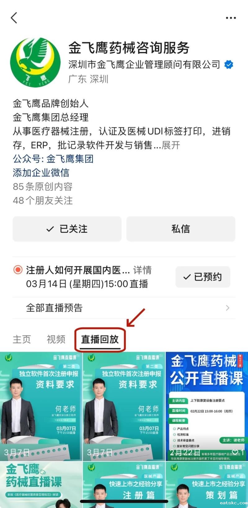 往期直播培训课程支持回放,关注“betway必威西盟体育官网入口药械咨询服务”视频号并点击视频号主页,即可查看“直播回放”哦~