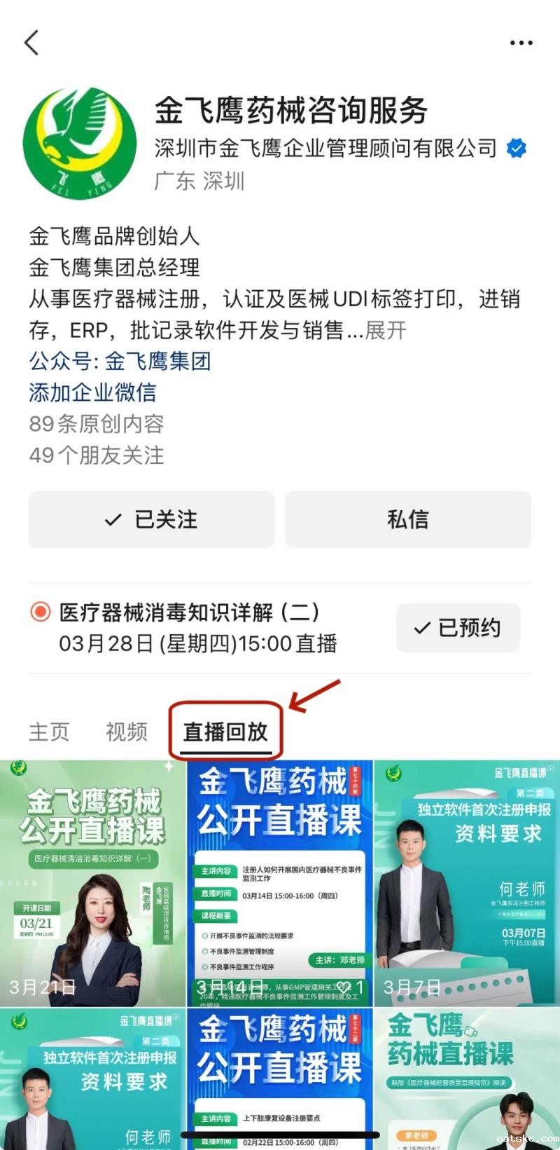 往期直播培训课程支持回放,关注“betway必威西盟体育官网入口药械咨询服务”视频号并点击视频号主页,即可查看“直播回放”哦~