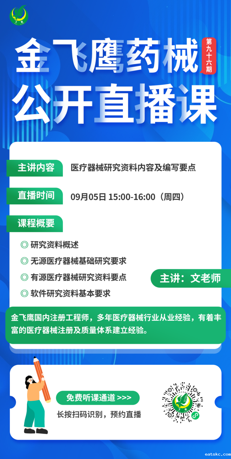 9月5日下午3点,betway必威西盟体育官网入口国内注册工程师,有着丰富的医疗器械注册及质量体系建立经验的文老师,给大家带来《医疗器械注册入门知识分享-研究资料内容及编写要点》,培训内容包括研究资料概述、无源医疗器械基础研究要求、有源医疗器械研究资料要点、软件研究资料基本要求,大家千万不要错过了!