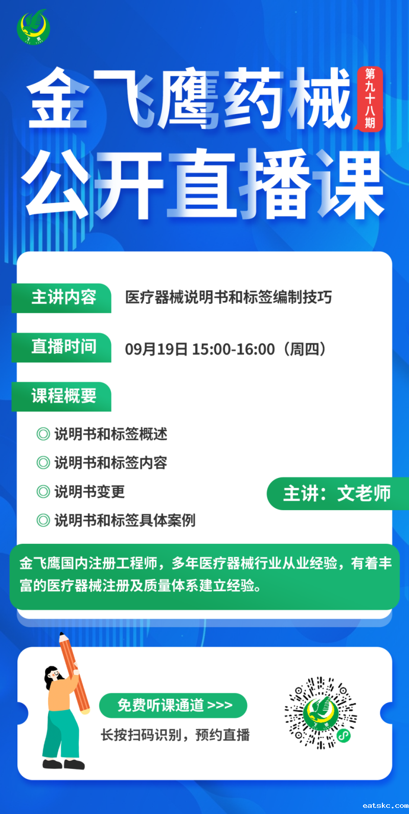 9月19日下午3点,betway必威西盟体育官网入口国内注册工程师,有着丰富的医疗器械注册及质量体系建立经验的文老师,给大家带来《医疗器械注册入门知识分享-产品说明书和标签编制技巧》,培训内容包括说明书和标签概述、说明书和标签内容、说明书变更、说明书和标签具体案例,大家千万不要错过了!