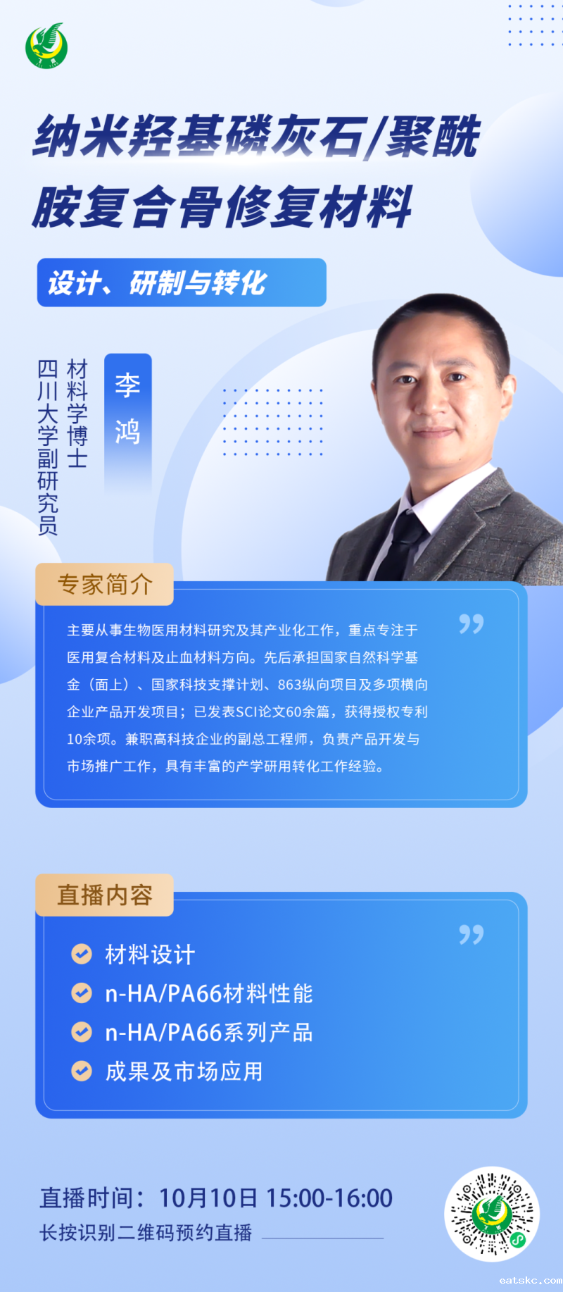 10月10日下午3点,李老师给大家带来《纳米羟基磷灰石/聚酰胺复合骨修复材料的设计、研制与转化》,将从材料设计、材料性能、研究成果及市场应用等方面给大家详细介绍,对此类高分子材料感兴趣的朋友千万不要错过了哦~