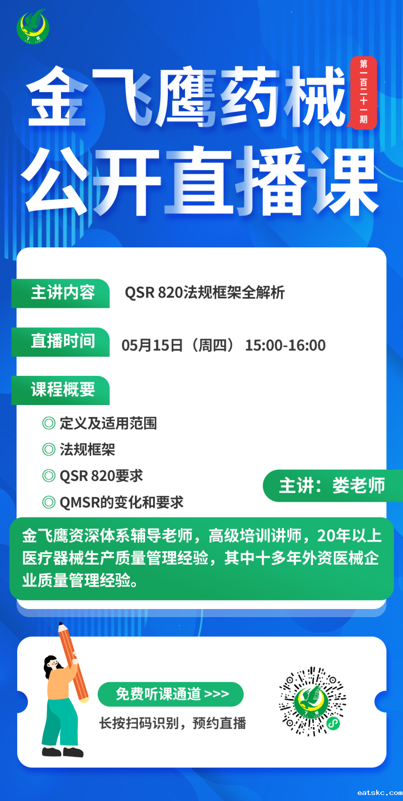 5月15日下午3点,betway必威西盟体育官网入口资深体系辅导老师、有着十多年外资医械企业质量管理经验的娄老师给大家带来《QSR 820法规框架全解析》,他将从基本概念和基本要求两部分出发,帮助相关企业深入理解QSR 820法规框架,在此基础上建立起符合法规需求的QSR 820体系。接下来我们还会在另一期直播课中深入讲解FDA现场检查应对策略,感兴趣的朋友记得持续关注哦~