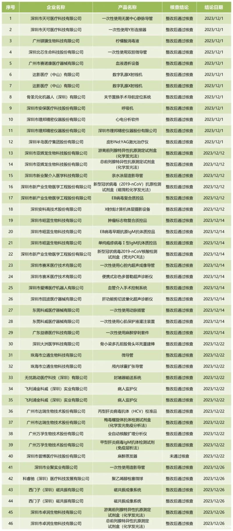 1月22日,广东省药监局官网公布2023年12月医疗器械注册质量管理体系核查结果,包括深圳半岛医疗集团股份有限公司、深圳市新产业生物医学工程股份有限公司、飞利浦金科威(深圳)实业有限公司在内的30家公司共计46款产品,其中45款产品为“整改后通过核查”,有一款产品“未通过核查”。具体明细见下方表格: