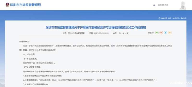 3月24日,深圳市市场监督管理局发布《关于开展医疗器械经营许可远程视频核查试点工作的通知》,具体内容如下: