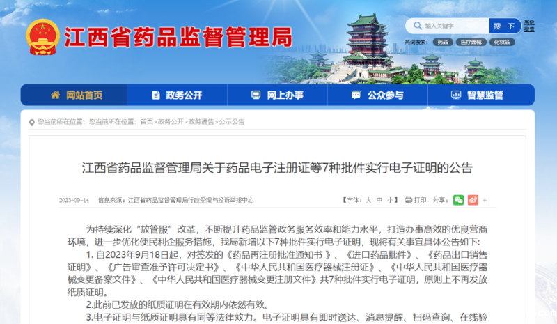 1. 自2023年9月18日起,对签发的《药品再注册批准通知书 》、《进口药品批件》、《药品出口销售证明》、《广告审查准予许可决定书》、《中华人民共和国医疗器械注册证》、《中华人民共和国医疗器械变更备案文件》、《中华人民共和国医疗器械变更注册文件》共7种批件实行电子证明,原则上不再发放纸质证明。
