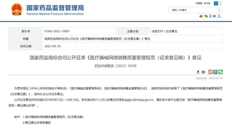 9月18日,国家药监局官网发布《医疗器械网络销售质量管理规范(征求意见稿)》(以下简称《管理规范》),并向社会公开征求意见。