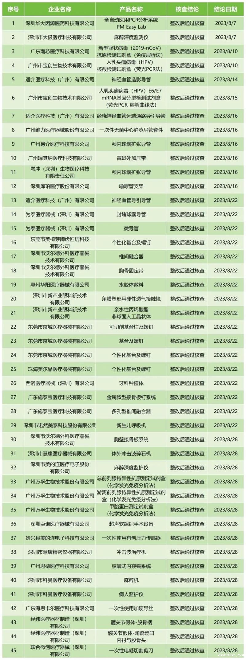9月18日,广东省药监局官网公布2023年8月医疗器械注册质量管理体系核查结果,包括深圳市沃尔德外科医疗器械技术有限公司、广州万孚生物技术股份有限公司、深圳市科曼医疗设备有限公司在内的32家公司共计45款产品,均为“整改后通过核查”。具体明细见下方表格: