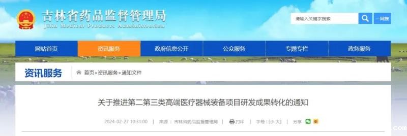 2月27日,吉林省药监局发布《关于推进第二第三类高端医疗器械装备项目研发成果转化的通知》(以下简称《通知》),拟加快推进吉林省境内第二三类在研、在审高端医疗器械研发成果转化。