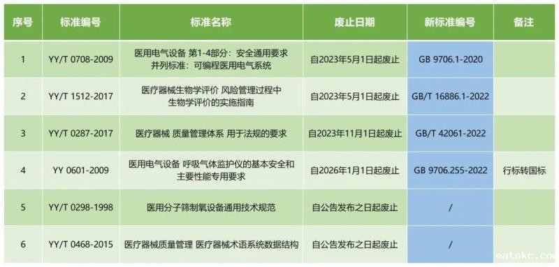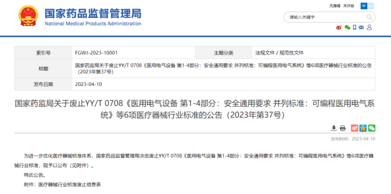 4月10日,国家药监局官网发布公告称,废止YY/T 0708-2009《医用电气设备 第1-4部分:安全通用要求 并列标准:可编程医用电气系统》、YY/T 0287-2017《医疗器械 质量管理体系 用于法规的要求》等6项行业标准,在国家药监局发布的原有附件基础上,我们加上了这几项标准的新版替代标准,具体如下: