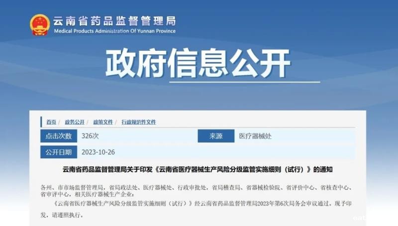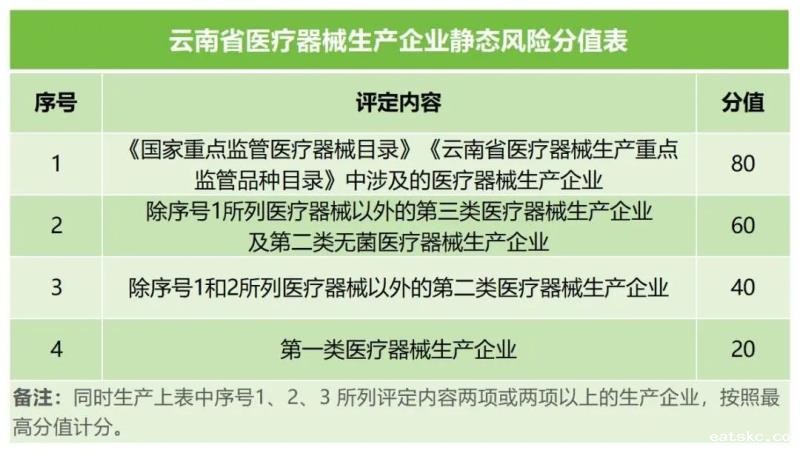 10月26日,云南省药监局官网发布《云南省医疗器械生产风险分级监管实施细则(试行)》(以下简称《实施细则》),其中指出设定医疗器械生产企业静态风险和动态风险评价指标及分值,根据计分结果确定医疗器械生产企业风险等级。