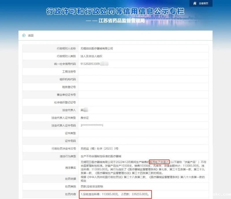 近日,江苏省药监局官网公布一则行政处罚信息,江苏无锡某医疗器械企业因生产不符合国家强制性标准的电子体温计,被罚款339255元,同时被没收违法所得113085元,总计被罚没45万余元。