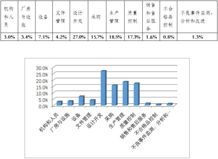 从各章节不符合项总数占比来看,占据前四位的分别为设计开发(27%)、生产管理(18.5%)、质量管理(17.3%)和采购(15.7%)。