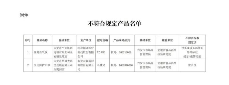 (一)脉搏血氧仪1批:标示为河北循证医疗科技股份有限公司生产,设备或设备部件的外部标记 提示/报警功能不符合标准规定。 (二)医用防护口罩1批:标示为泰安双赢新材料股份有限公司生产,密合性不符合标准规定。