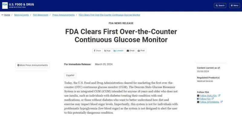 近日,FDA批准销售首款非处方(OTC)连续血糖监测仪(CGM)。这款Stelo Glucose Biosensor System,是一种集成的CGM (iCGM),适用于18岁及以上不使用胰岛素的任何人,例如使用口服药物治疗病情的糖尿病患者,或希望更好地了解饮食和运动如何影响血糖水平的非糖尿病患者。值得注意的是,这个系统不适用于有严重低血糖问题的个体,因为该系统并未设计来提醒用户这种潜在的危险状况。