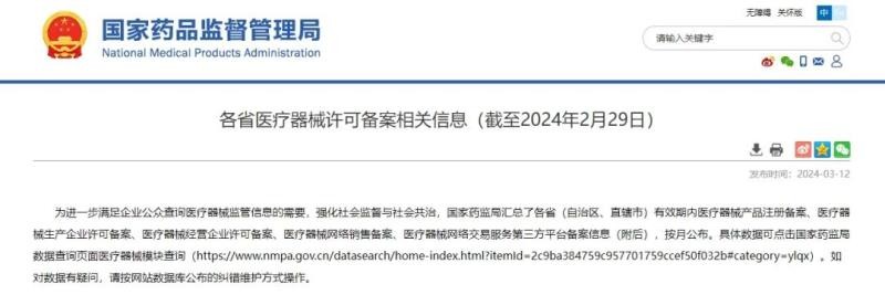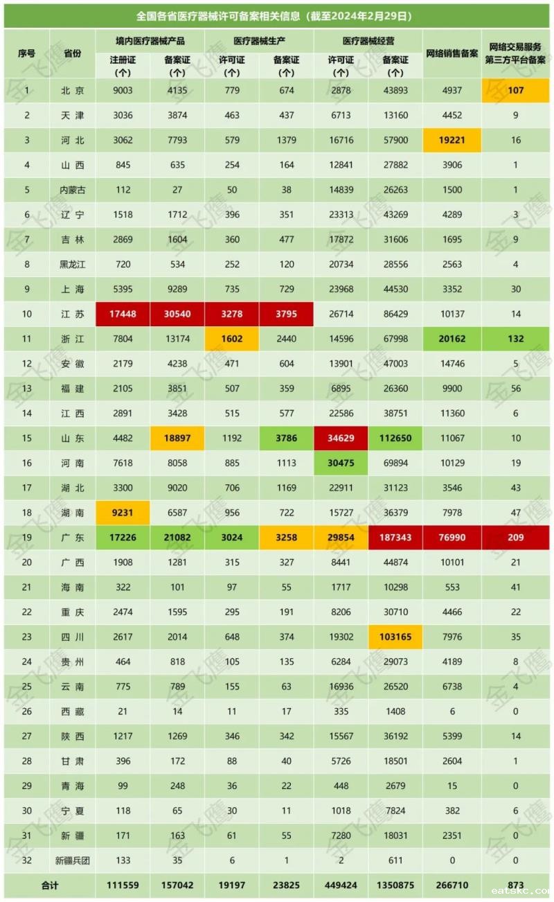 3月12日,国家药监局公布了截至2024年2月29日各省有效期内医疗器械产品注册备案、医疗器械生产企业许可备案等信息,老规矩,betway必威西盟体育官网入口小编对此稍作编辑,标注红色、绿色、黄色的分别为前三甲。