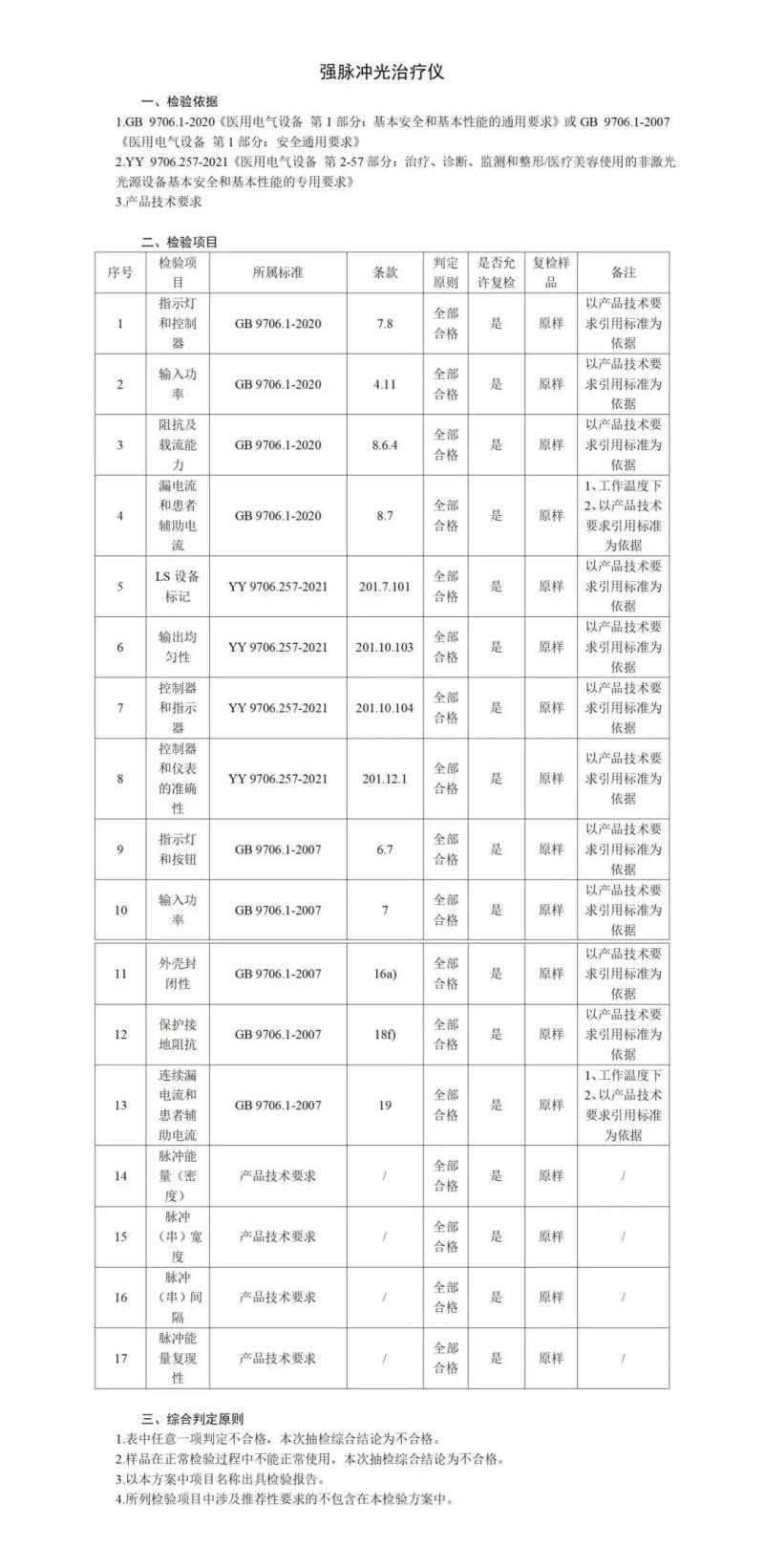 其中针对强脉冲光治疗仪,国家药监局共提出了漏电流和患者辅助电流、LS设备标记、输出均匀性、脉冲(串)宽度、脉冲(串)间隔等17个检验项目,同时指出,任意一项判定不合格,抽检综合结论即为不合格。具体如下: