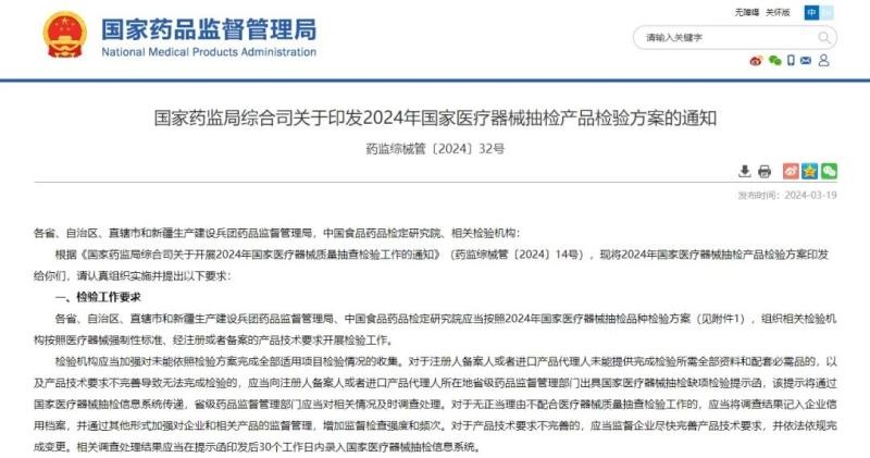 3月19日,国家药监局官网发布《2024年国家医疗器械抽检产品检验方案》,强脉冲光治疗仪、医用脉搏血氧仪、医用分子筛制氧机、超声治疗设备、水胶体敷料等66个品种被纳入抽检品种名单。