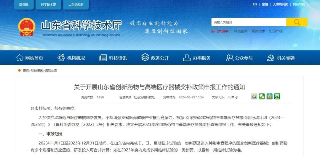 近日,山东省科学技术厅发布通知称,根据《山东省创新药物与高端医疗器械引领行动计划(2023-2025年)》(鲁科创委办发〔2022〕3号)相关要求,决定开展2023年度创新药物与高端医疗器械奖补政策申报工作,有关事项具体如下: