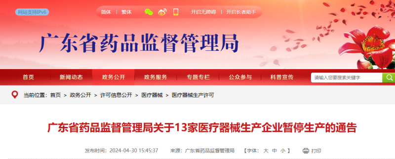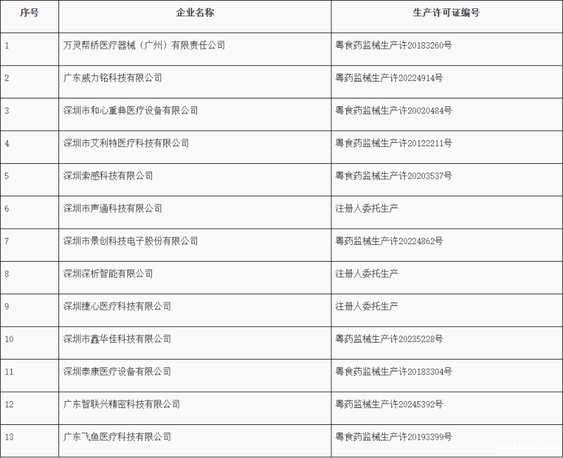 近期,广东省药品监督管理局组织开展医疗器械生产企业监督检查,发现以下13家企业质量管理体系存在严重缺陷,不符合《医疗器械生产质量管理规范》相关规定,广东省药品监督管理局已依法采取责令暂停生产的控制措施。