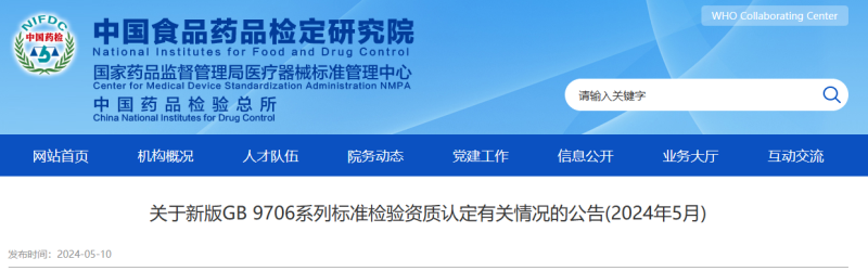 近日,中检院发布通告:按照《国家药监局综合司关于印发〈GB 9706.1-2020及配套并列标准、专用标准实施工作方案〉的通知》要求,为全面摸清底数,统计了截至2024年5月6日,75个新版GB 9706系列标准检验资质认定情况和GB 9706.1-2020、YY 9706.102-2021获证机构信息(详见附表)。