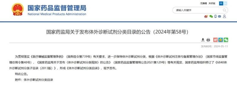 一、总体说明 (一)《分类目录》所包括体外诊断试剂,是指按医疗器械管理的体外诊断试剂,不包括国家法定用于血源筛查的体外诊断试剂和采用放射性核素标记的体外诊断试剂。 (二)《分类目录》以《关于发布〈体外诊断试剂分类规则〉的公告》(以下简称《分类规则》)为依据,根据体外诊断试剂的特点编制而成,《分类目录》结构由“一级序号、一级产品类别、二级序号、二级产品类别、预期用途、管理类别”六个部分组成,其中“一级产品类别”主要依据《分类规则》设立,共25个;“二级产品类别”是在一级产品类别项下的进一步细化,主要根据检测靶标设置,原则上不包括方法或原理,共1852个;“预期用途”涉及的内容包括被测物及主要临床用途等,其目的主要是用于确定产品的管理类别,不代表对相关产品注册内容的完整描述。申请注册或者办理备案时,有关产品名称和预期用途应当按照《体外诊断试剂注册与备案管理办法》及相关要求执行。 分类编码继续沿用6840。 (三)被测物相同但在临床上用于不同预期用途、且根据《分类规则》属于不同管理类别的产品,若其在不同管理类别的用途都有较广泛的应用,则依据《分类规则》分别列入相应管理类别,低类别条目的预期用途描述中应当明确不包含按高类别管理的预期用途。 对于具有多种预期用途、但根据《分类规则》管理类别相同的产品,进行“一级产品类别”归类时,根据临床主要用途、特定用途优先归类。 (四)根据《分类规则》第六条规定,用于微生物鉴别或者药敏试验的培养基,以及用于细胞增殖培养,对细胞具有选择、诱导、分化功能,且培养的细胞用于体外诊断的细胞培养基,按照第二类管理。符合《分类规则》且风险较低的仅做选择性培养、不具备微生物鉴别及药敏功能的微生物培养基,按照第一类管理。 (五)按照第一类管理的细胞培养基,仅保留基础培养基产品,如RPMI -1640 培养基,并根据《分类规则》明确用途限制(不用于细胞治疗、细胞回输、辅助生殖等非体外诊断用途)。 (六)根据《分类规则》第六条、第七条规定,按照第一类管理的样本处理用产品,主要指检测反应发生前的样本预处理阶段所用的通用性产品,且不参与反应。原则上此类产品仅包括仪器平台通用或方法学通用的样本处理用试剂,不包括针对具体检测项目的样本处理用试剂。 (七)按照第一类管理的反应体系通用试剂,主要指检测反应阶段维持反应体系环境的通用性试剂。仅包括仪器平台通用或方法学通用的反应体系试剂,不针对具体检测项目。不可对完整的产品进行拆分后单独注册/备案。 (八)按照第一类管理的染色液,主要指通用性产品,不含特异性的蛋白、抗原、抗体、酶等物质,按染色液主要化学成分或常用名称命名。 (九)根据《分类规则》,按照第一类管理的流式细胞仪用、免疫组化、原位杂交产品涉及的抗体或者探针,均为“单一抗体”或“单一探针”。原位杂交产品中针对单个基因检测的断裂基因探针、融合基因探针,因其产品的特性,需要两个探针共同完成某个基因的检测,视作“单一探针”;原位杂交产品中针对单个基因检测的,产品的组成中除主要的特异性探针外,另含有起“辅助定位”作用的探针的,视作“单一探针”。 根据《分类规则》,上述按照第一类管理的“单一抗体”或“单一探针”组合后,作为第二类或第三类管理。 (十)《分类规则》中“仅为专业医生提供辅助诊断信息的流式细胞仪用单一抗体”限指对体液中悬浮的细胞进行分析、提供辅助信息的单一抗体以及同型对照抗体。通过捕获体液中其他成分形成生物粒子、从而用流式细胞仪进行检测的体外诊断试剂,不符合《分类规则》中“流式细胞仪用单一抗体”有关要求,如在流式平台上,基于抗原抗体反应,以特定“微珠”或者“微球”为载体,对白介素、干扰素、肿瘤坏死因子等物质进行检测分析的试剂。 (十一)除第(九)条第二款列出的情形外,《分类目录》中未包含的组合产品,如组合后的预期用途仅为单项产品预期用途的组合,应当按照所包含的单项产品的最高管理类别确定其管理类别。如有新增预期用途,应当按照相关要求申请分类界定。 (十二)《分类目录》未包括校准品、质控品。根据《分类规则》,与第二类、第三类体外诊断试剂配合使用的校准品和质控品的管理类别,与试剂管理类别相同;与第一类体外诊断试剂配合使用的校准品和质控品,按第二类管理。 非定值质控品不作为医疗器械管理。 (十三)根据《分类规则》第六条、第七条规定,与麻醉药品、精神药品、医疗用毒性药品检测相关,并具有临床诊断用途、在临床机构使用的体外诊断试剂,按第三类管理。麻醉药品、精神药品或医疗用毒性药品的范围根据国家药监局、公安部、国家卫生健康委联合发布的《麻醉药品和精神药品品种目录》《医疗用毒性药品管理办法》所列的毒性药品品种,以及后续补充文件增加的品种进行确定。 (十四)根据医疗器械生产、经营、使用等情况,基于医疗器械风险分析、评价,按照《医疗器械分类目录动态调整工作程序》,及时更新调整《分类目录》。 (十五)自2025年1月1日起,《食品药品监管总局关于印发体外诊断试剂分类子目录的通知》(食药监械管〔2013〕242号)、《关于过敏原类、流式细胞仪配套用、免疫组化和原位