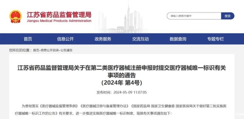 随着第三批医疗器械唯一标识实施日期的临近,近日,江苏省药监局发布《关于在第二类医疗器械注册申报时提交医疗器械唯一标识有关事项的通告(2024年 第4号)》,具体如下: