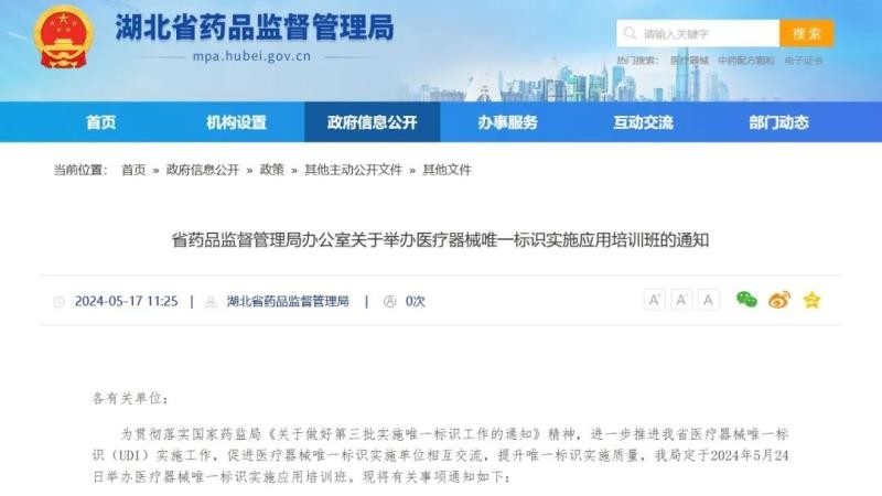 5月17日,湖北省药监局发布通知称,该局定于2024年5月24日举办医疗器械唯一标识实施应用培训班。相关培训信息具体如下: