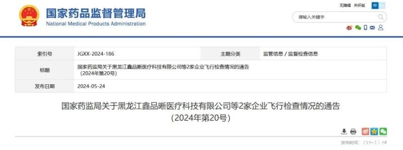 5月24日,国家药监局发布通告称,近期组织对黑龙江鑫品晰医疗科技有限公司、三原富生医疗器械有限公司2家企业进行飞行检查,发现这些企业质量管理体系主要存在以下缺陷: