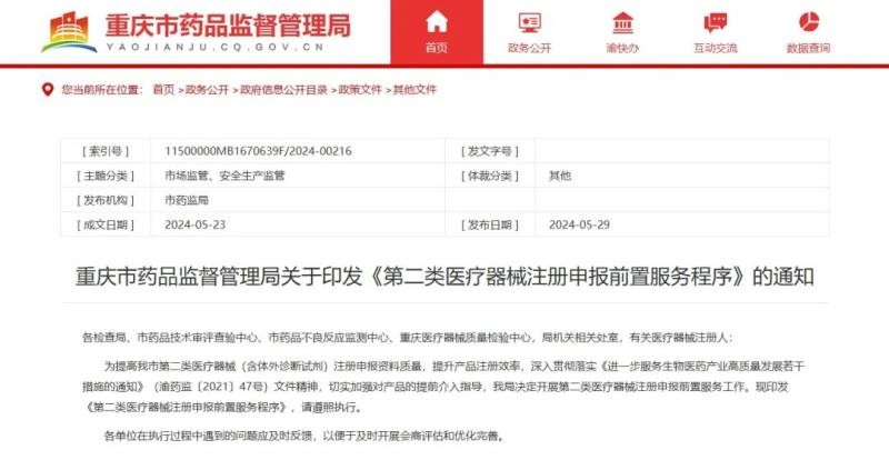 为提高我市第二类医疗器械(含体外诊断试剂)注册申报资料质量,提升产品注册效率,深入贯彻落实《进一步服务生物医药产业高质量发展若干措施的通知》(渝药监〔2021〕47号)文件精神,切实加强对产品的提前介入指导,我局决定开展第二类医疗器械注册申报前置服务工作。