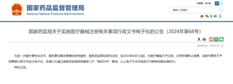 近日,国家药监局发布公告称,自2024年6月1日起,对医疗器械不予注册、注册申请终止审查、说明书更改不予同意等行政文书实行电子化,申请人可通过国家药监局政务服务门户“我的办件”查询。以上电子文书与纸质文书具有同等法律效力。