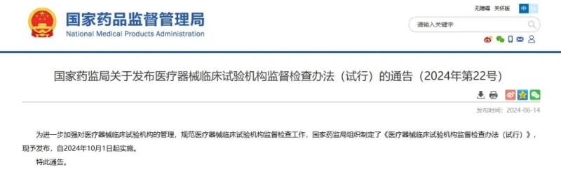 近日,国家药监局组织发布《医疗器械临床试验机构监督检查办法(试行)》(以下简称《办法》),并宣布自2024年10月1日起实施。