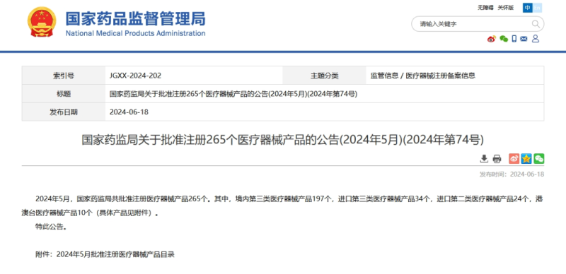 6月18日,国家药监局官网发布公告称,2024年5月,国家药监局共批准注册医疗器械产品265个。其中,境内第三类医疗器械产品197个,进口第三类医疗器械产品34个,进口第二类医疗器械产品24个,港澳台医疗器械产品10个。