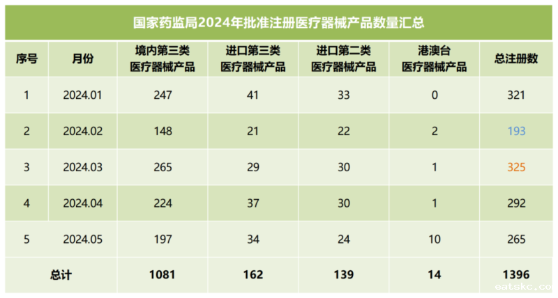 我们同步汇总了2024年前五个月国家药监局批准注册的医疗器械产品数量(见下方表格),从表格中可以看出,截至5月,2024年国家药监局总计批准注册医疗器械产品1396个,其中境内第三类医疗器械产品1081个,进口第三类医疗器械产品162个,进口第二类医疗器械产品139个,港澳台医疗器械产品14个。