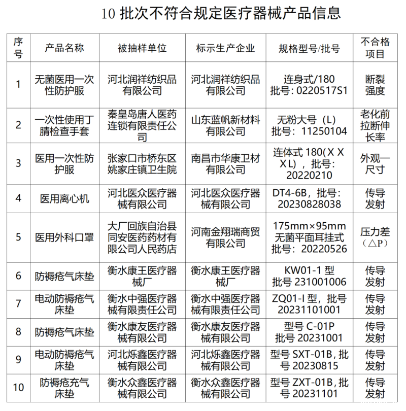 为加强医疗器械质量监督管理,保障医疗器械质量安全有效,按照《医疗器械监督管理条例》及《河北省医疗器械监督抽验管理办法》有关规定,河北省药品监督管理局组织对2023年全省生产、经营和使用等环节医疗器械进行了质量监督抽检,发现10批次产品不符合标准规定,并已依法分别予以查处,现予以公开。