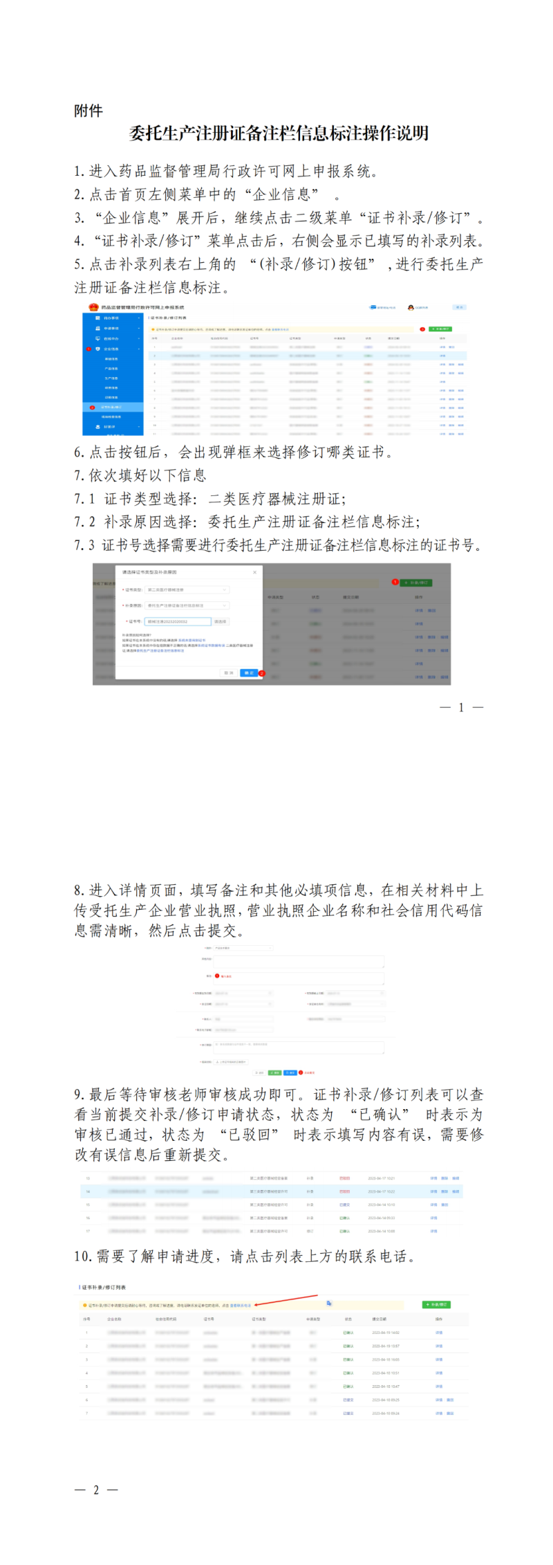 一、自2024年6月1日起,涉及境内委托生产的注册申请或者延续注册申请,省局将在医疗器械注册证生产地址栏中登载受托生产地址并注明“(委托生产)”,同时在备注栏备注受托生产企业名称和统一社会信用代码,备注形式为“受托生产企业:XXXX公司;统一社会信用代码:XXXX”。变更注册涉及注册人委托生产的,也将在变更注册文件中按照上述方式注明委托生产相关信息,并将变更信息在注册证书生产地址和备注相应字段中更新。 二、仅受托生产企业名称文字性变化的,无需申请变更备案,在延续注册时,核发修改后的注册证。 三、对省内已核发的涉及境内委托生产的注册证,若未按照上述要求标注相关信息,注册人可按照附件操作说明申请标注,相关工作应在8月31日前完成。 四、注册人不再进行委托生产的,应当及时向省局核减受托生产地址;受托生产企业应当及时向所在地省级药品监督管理部门报告有关情况。 五、注册人在申请标注过程中存在疑问的,可与省局相关部门联系。医疗器械注册管理处,0791-88158031;系统运维工程师,0791-88125223(吴工)、0791-86507350(涂工)。