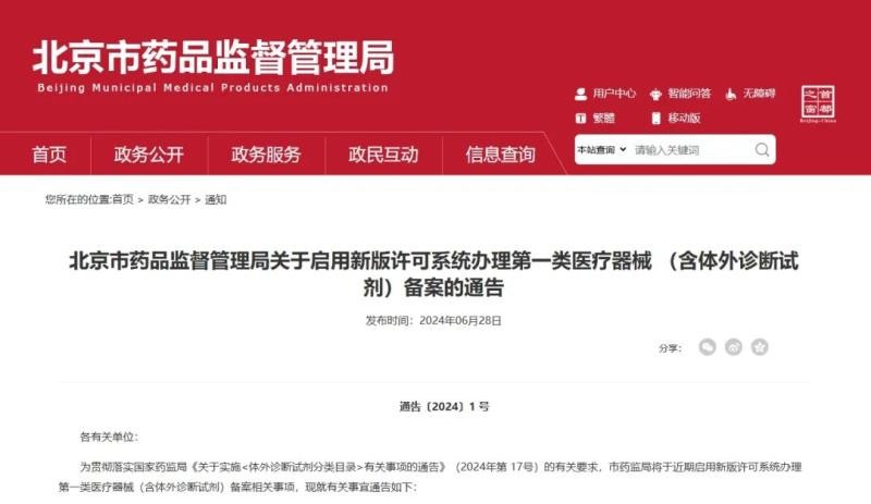 近日,北京市药监局发布通告称,自2024年7月1日起,第一类医疗器械(含体外诊断试剂备案相关事项(含新办、变更)使用新版许可系统办理。上述事项的原申报入口同步关闭