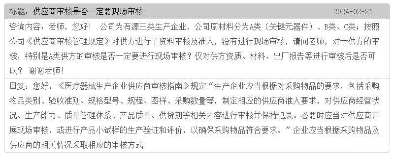 有源医疗器械产品生产可能会需要用到不同种类的原材料,按照采购物料分级可分为A类(关键元器件)、B类、C类,那么生产企业对于A类关键原材料供应商的审核,是否一定要进行现场审核呢?仅对其资质、材料、出厂报告等进行审核是否可行?