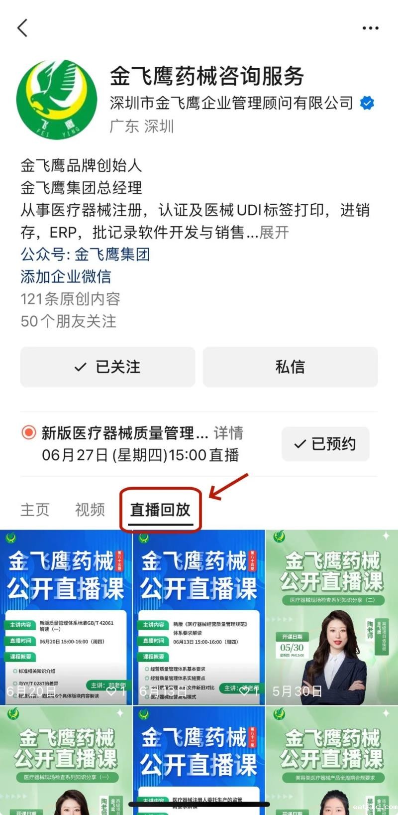 往期直播培训课程支持回放,关注“betway必威西盟体育官网入口药械咨询服务”视频号并点击视频号主页,即可查看“直播回放”哦~