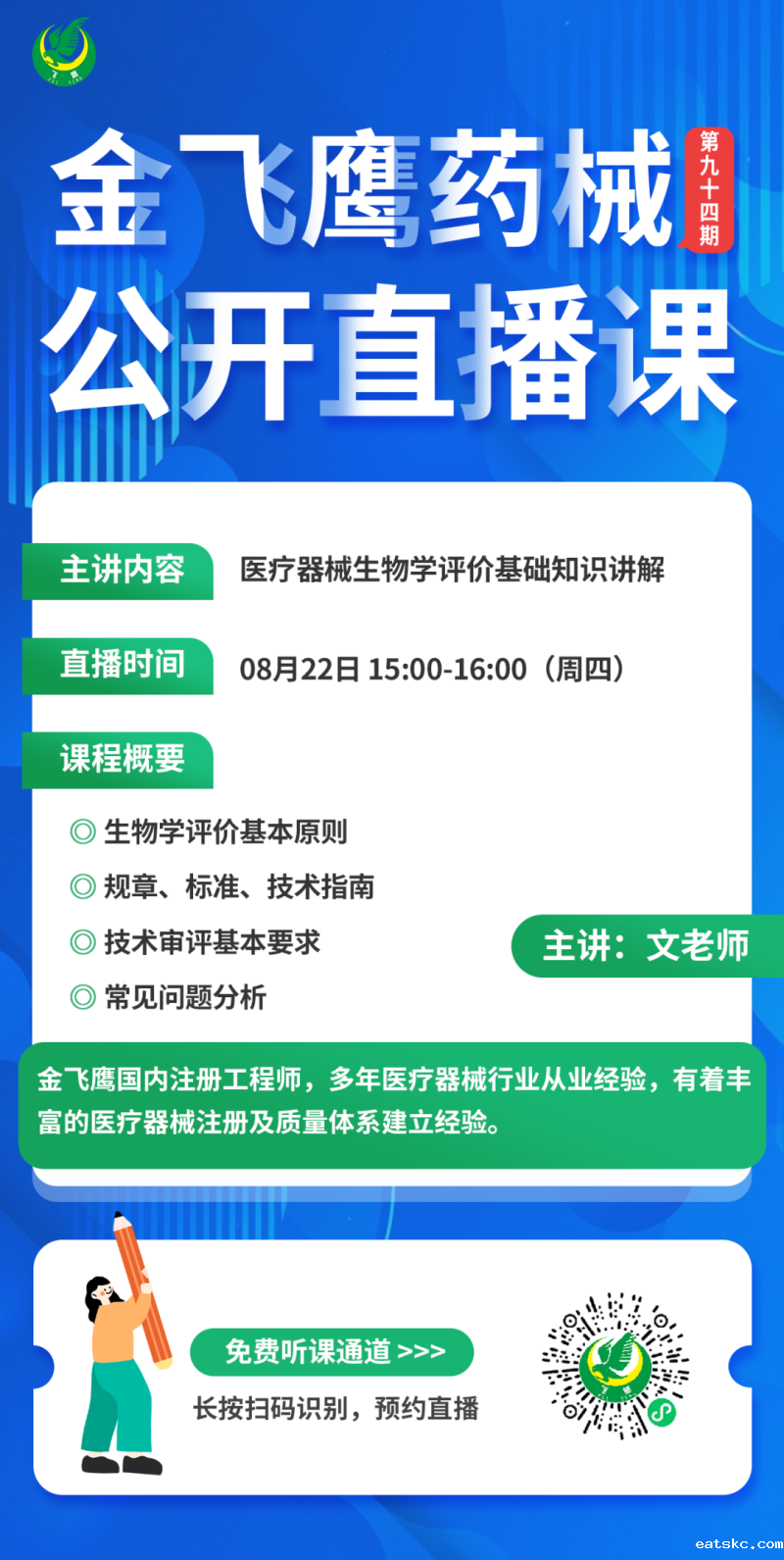 8月22日下午3点,betway必威西盟体育官网入口国内注册工程师,有着丰富的医疗器械注册及质量体系建立经验的文老师,给大家带来《医疗器械生物学评价基础知识讲解》,培训内容包括生物学评价基本原则、规章/标准/技术指南、技术审评基本要求、常见问题分析,大家千万不要错过了!
