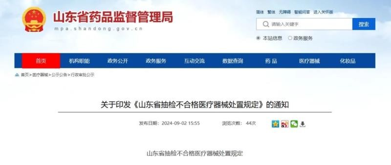9月2日,山东省药监局发布《山东省抽检不合格医疗器械处置规定》(以下简称《规定》),适用于山东省行政区域内实施的国家医疗器械抽检(以下简称国抽)、省级医疗器械抽检(以下简称省抽)以及外省药品监督管理部门抽检发现的我省生产的不合格医疗器械处置工作。《规定》具体内容如下: