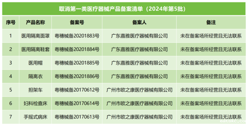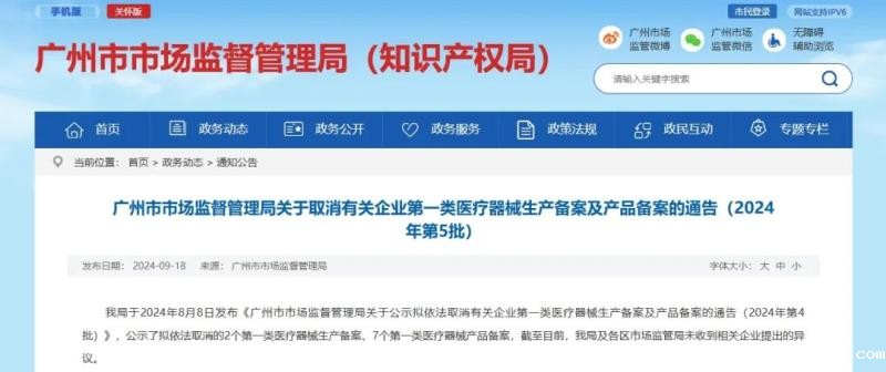 9月18日,广州市市场监督管理局官网发布一则取消第一类医疗器械生产备案及产品备案的通告,通告指出,因广东嘉雅医疗器械有限公司、广州市欧之康医疗器械有限公司未在备案场所经营且无法联系,在公示期间该局及各区市场监管局未收到相关企业提出的异议。