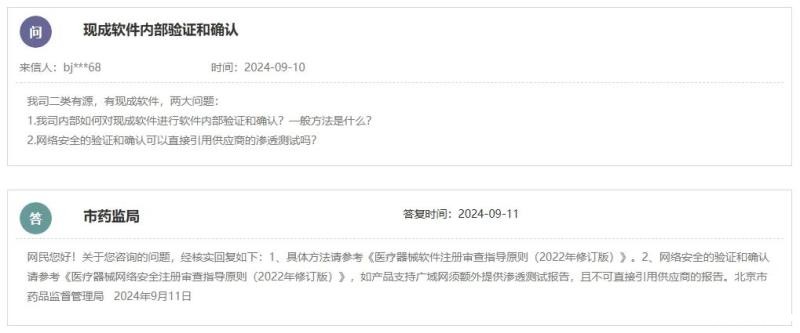 根据北京市药监局的答复,软件验证和确认具体方法可参考《医疗器械软件注册审查指导原则(2022年修订版)》;网络安全的验证和确认则可参考《医疗器械网络安全注册审查指导原则(2022年修订版)》,如产品支持广域网,需额外提供渗透测试报告,且不可直接引用供应商的报告。