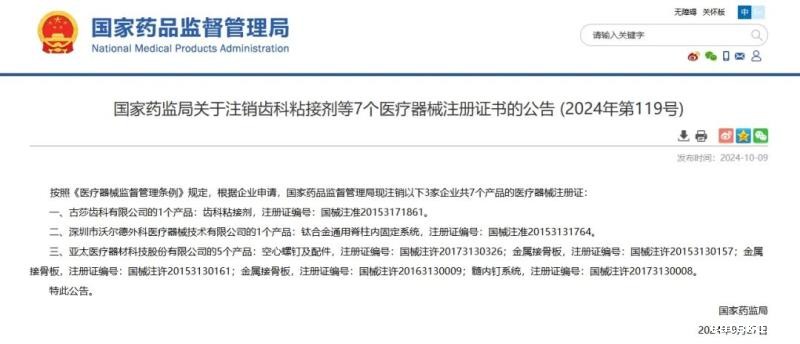 10月9日,国家药监局发布一则医疗器械注册证注销公告,公告显示,该局已依法注销古莎齿科有限公司、深圳市沃尔德外科医疗器械技术有限公司等3家企业共计7个产品的医疗器械注册证,具体如下: