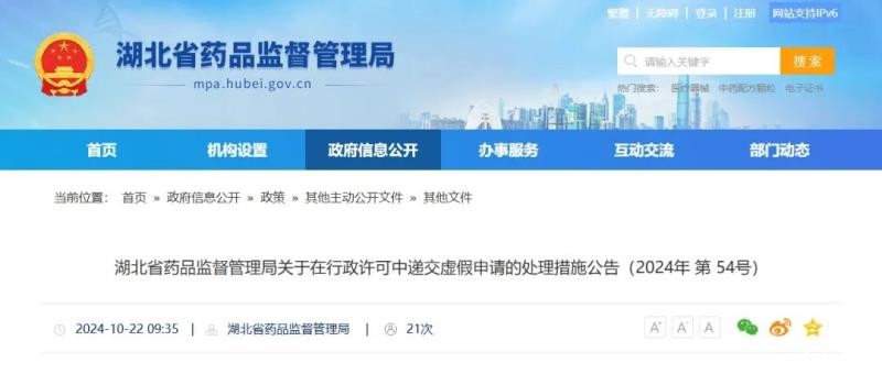 10月22日,湖北省药监局发布《关于在行政许可中递交虚假申请的处理措施公告》,其中提到: