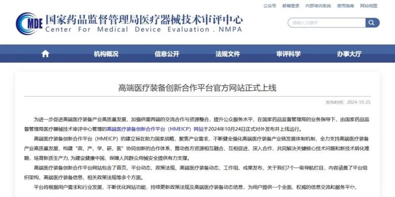 近日,国家药监局器审中心(以下简称“器审中心”)发布动态称,由器审中心管理的高端医疗装备创新合作平台(HMEICP)网站已于2024年10月24日正式对外发布并上线运行。