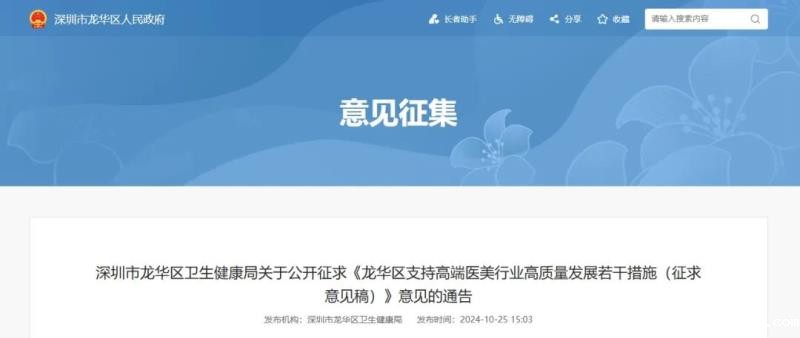 近日,深圳市龙华区卫生健康局发布《龙华区支持高端医美行业高质量发展若干措施(征求意见稿)》(以下简称《若干措施》),并向社会公开征求意见。
