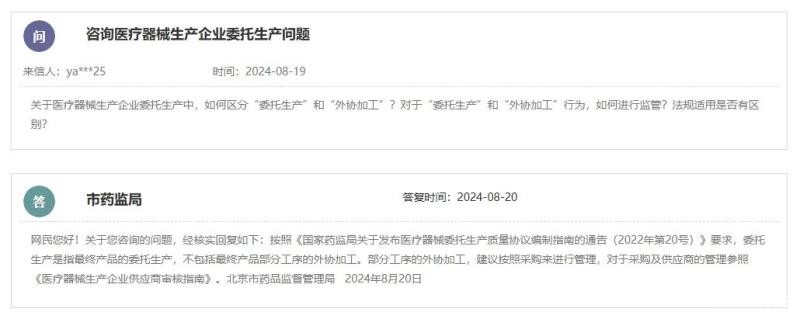 根据北京市药监局的答复,按照《国家药监局关于发布医疗器械委托生产质量协议编制指南的通告(2022年第20号)》要求,委托生产是指最终产品的委托生产,不包括最终产品部分工序的外协加工。部分工序的外协加工,建议按照采购来进行管理,对于采购及供应商的管理参照《医疗器械生产企业供应商审核指南》。