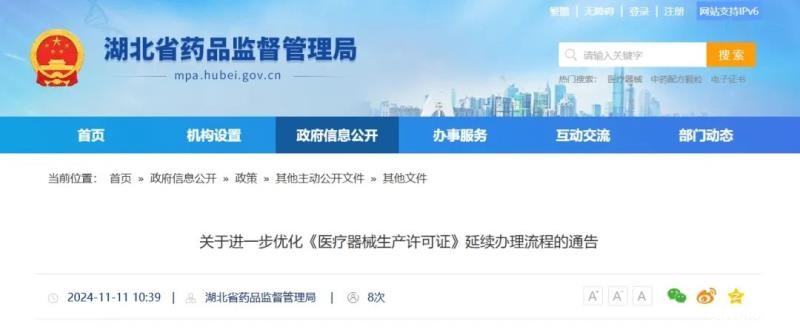 11月11日,湖北省药监局发布《关于进一步优化〈医疗器械生产许可证〉延续办理流程的通告》(以下简称《通告》),具体内容如下: