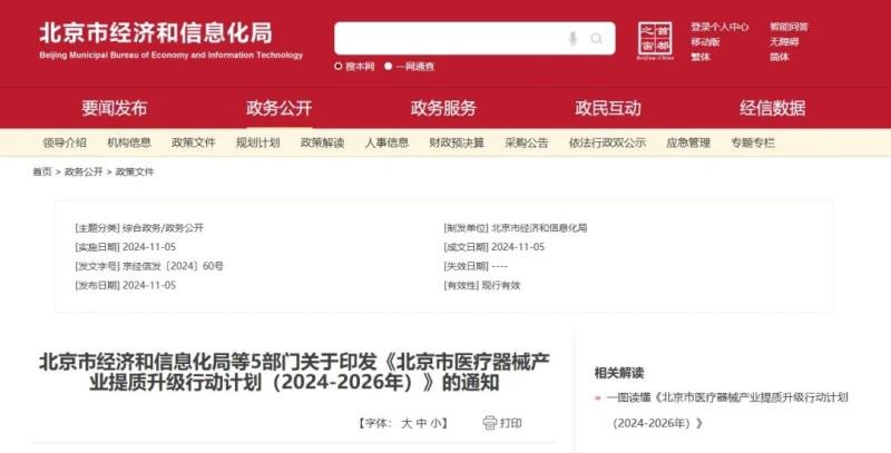 近日,北京市经济和信息化局、北京市药品监督管理局等5部门联合制定了《北京市医疗器械产业提质升级行动计划(2024-2026年)》(以下简称《行动计划》),并予以发布。